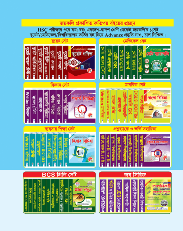 অভিজ্ঞ শিক্ষক ও মেধাবী শিক্ষার্থীদের সমন্বিত প্রয়াসে রচিত ঢাবি, জবি, জাবি, রাবি, চবি, খুবি, কুবি, শাবিপ্রবি, হাবিপ্রবি, GST গুচ্ছ ও জাতীয় বিশ্ববিদ্যালয় ভর্তি পরীক্ষার সর্বোত্তম মডেল টেস্ট – জয়কলি ব্যবসায় শিক্ষা মডেল টেস্ট বই।